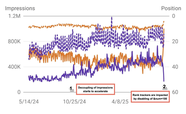 He shared a chart showing a clear drop in desktop impressions and a jump in average position, suggesting that removing the 100-results-per-page option may have affected reporting more than expected.